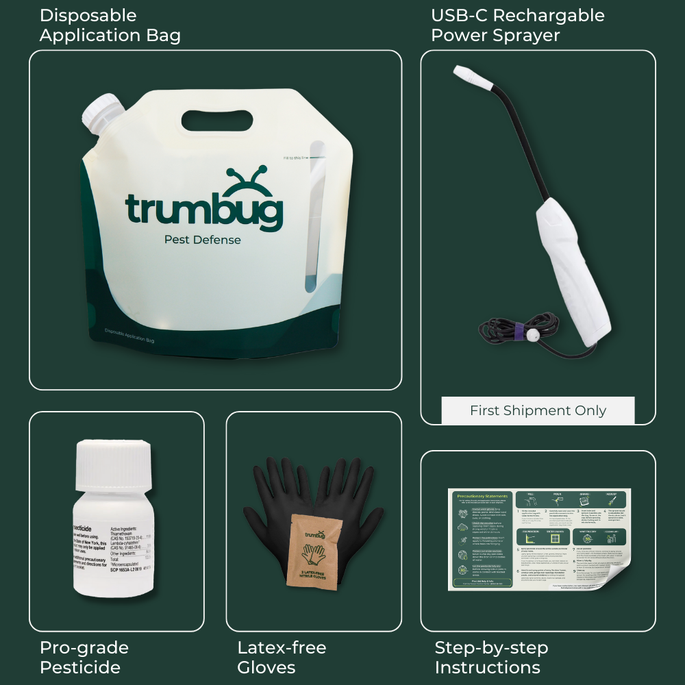 Trumbug provides pest control kits to its customers on a one-time or 90-day subscription schedule. These shipments include an EPA registered pesticide in the original packaging (based upon location and state requirements), the approved EPA label, and several pieces of application equipment. Shipments contain a combination of separately named products shipped to the customer to help control unwanted insects.